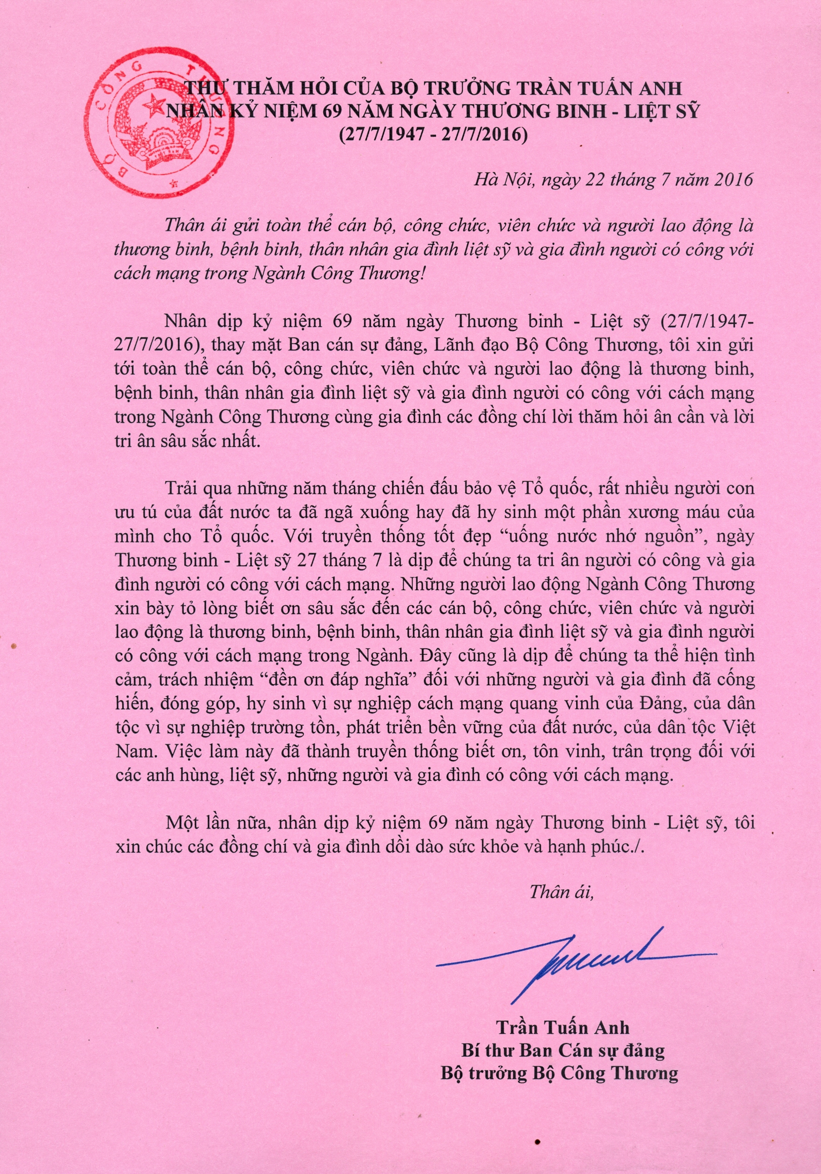 Bộ trưởng Bộ Công Thương Trần Tuấn Anh gửi thư thăm hỏi nhân 27/7