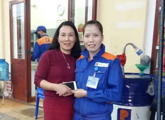 Nhân viên CHXD số 5 Bùi Thị Thùy Giang trao điện thoại trả lại chị Hương - người đánh rơi điện thoại