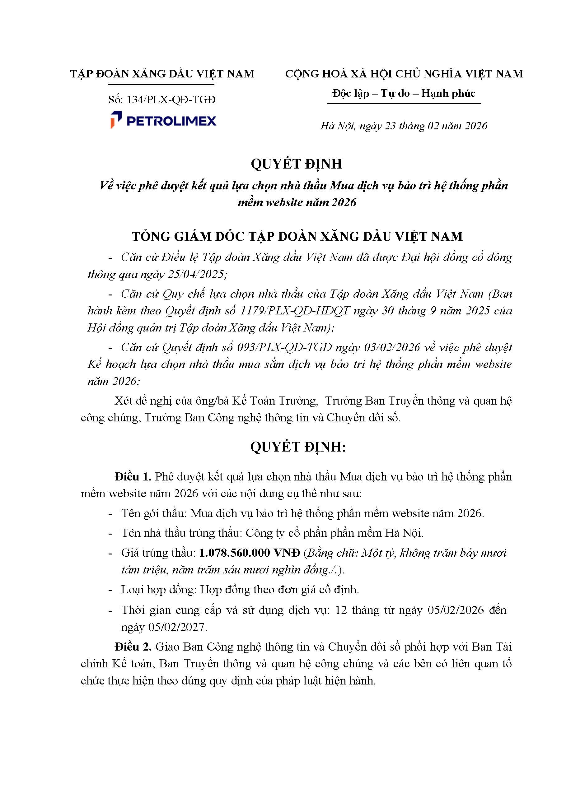 Quyết định kết quả lựa chọn nhà thầu Mua dịch vụ bảo trì hệ thống phần mềm website năm 2026