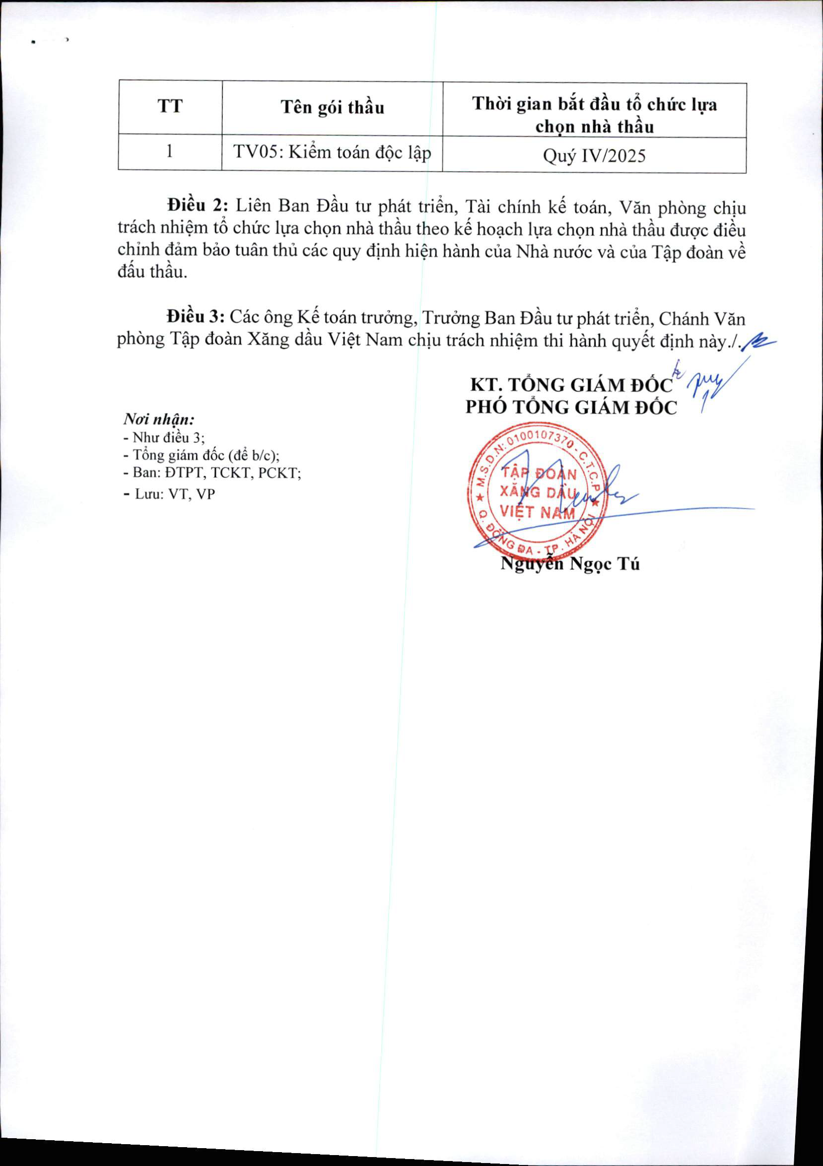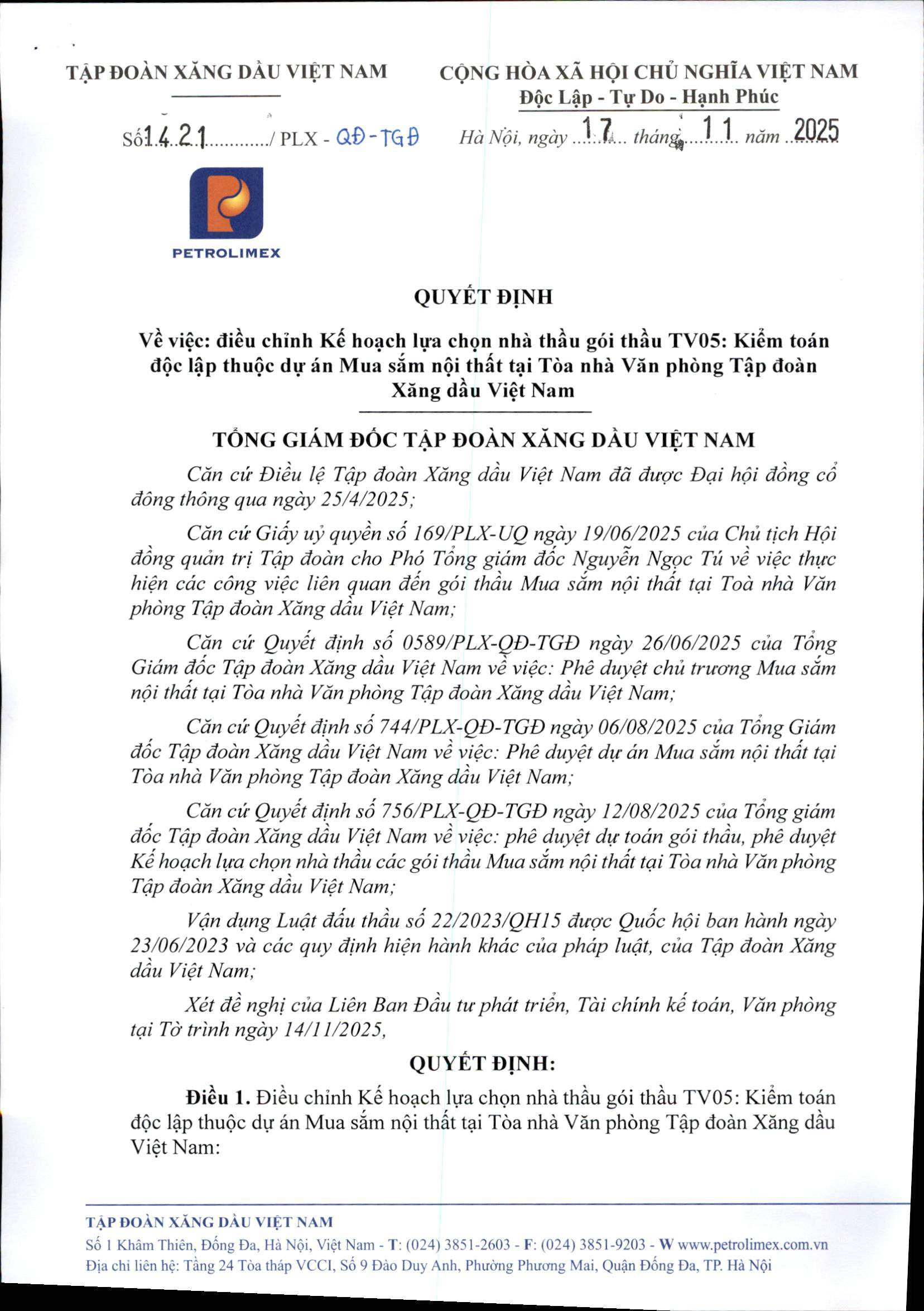 Quyết định về việc điều chỉnh Kế hoạch lựa chọn nhà thầu gói thầu TV05