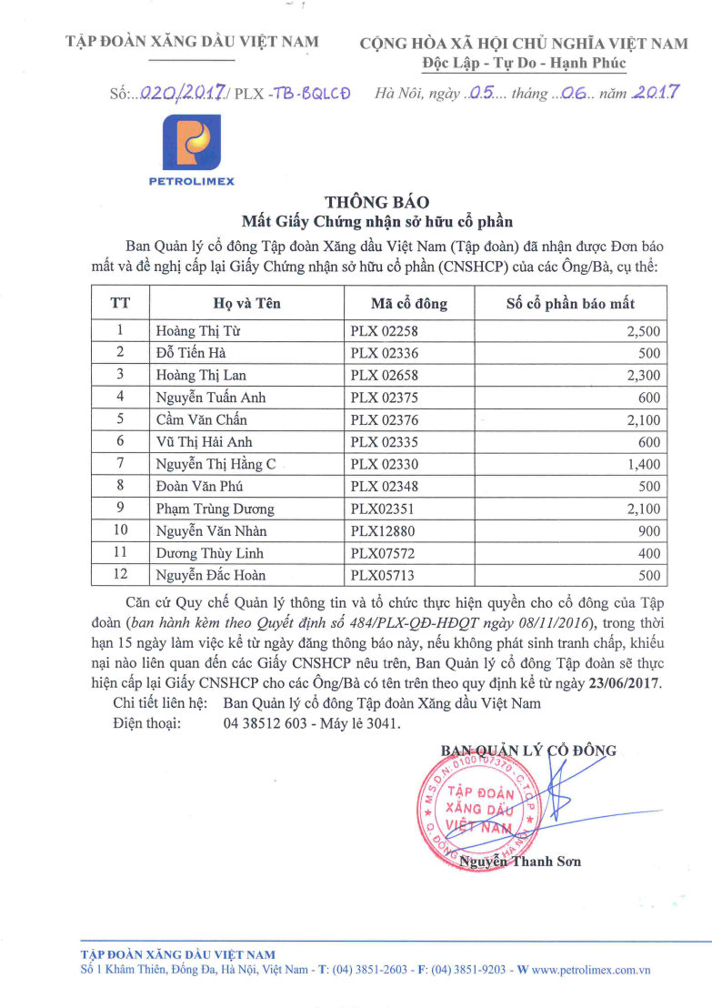 Danh sách chi tiết tạiThông báosố 020/2017/PLX-TB-BQLCĐ ngày 05.6.2017và các mẫu Đơn đề nghị cấp lại GCNSHCP & Giấy đề nghị hiệu chỉnh thông tin - để Quý vị Cổ đông thuận tiện trong tra cứu, sử dụng.