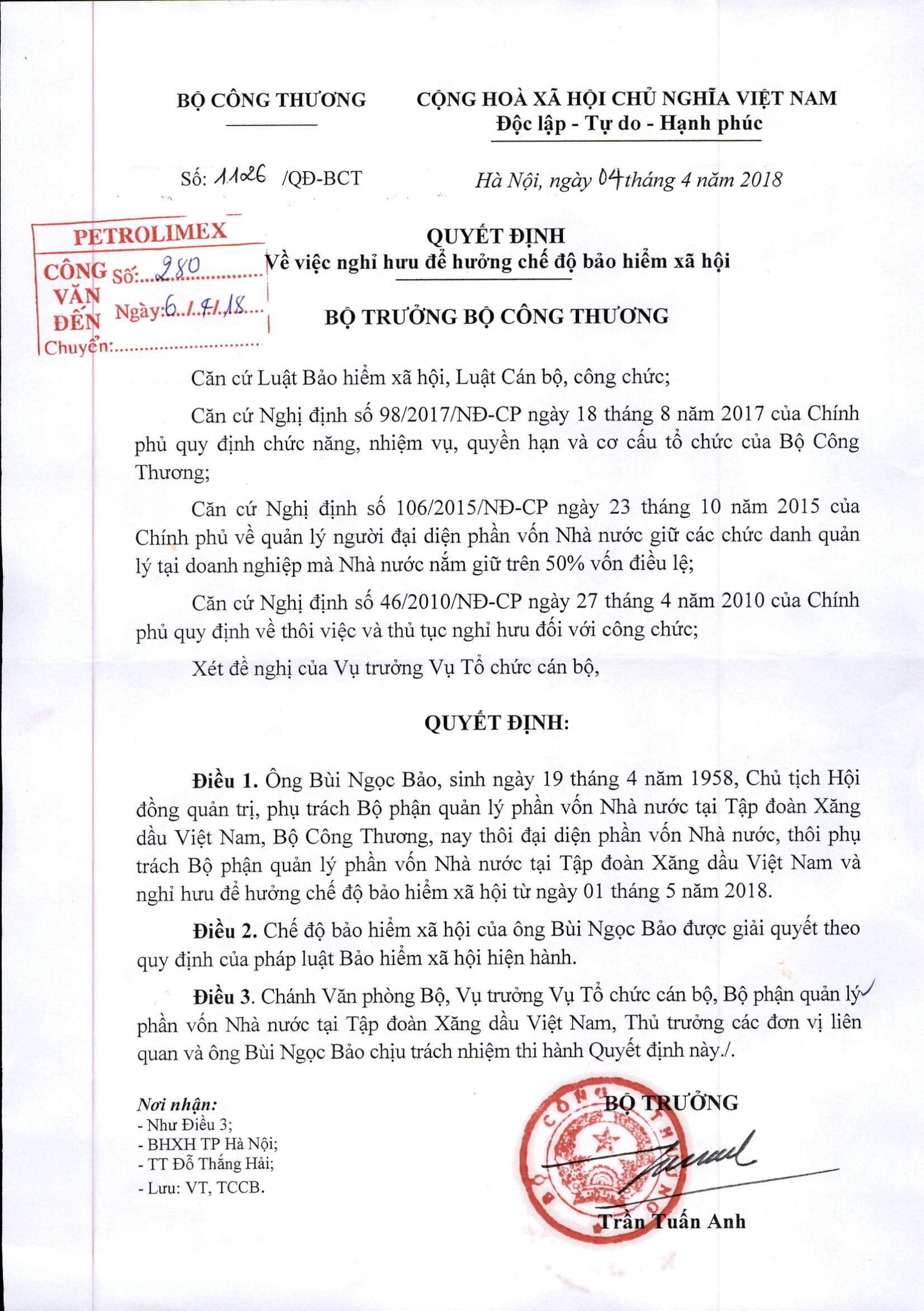 Ông Bùi Ngọc Bảo - Chủ tịch HĐQT Petrolimex nghỉ hưu để hưởng chế độ BHXH từ 01/5