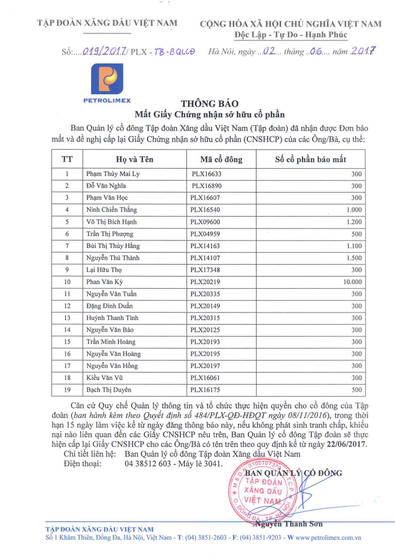 Danh sách chi tiết tạiThông báosố 019/2017/PLX-TB-BQLCĐ ngày 02.6.2017và các mẫu Đơn đề nghị cấp lại GCNSHCP & Giấy đề nghị hiệu chỉnh thông tin - để Quý vị Cổ đông thuận tiện trong tra cứu, sử dụng.